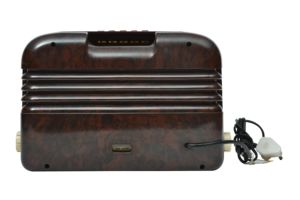 This 5-valve receiver was first introduced in 1950. Housed in a moulded bakelite case. This radio proved to be a very popular choice with blind and partially sighted users as the 5 push buttons made for easy access to pre-set tuned stations and waveband selection. This radio also featured an internal frame aerial.
