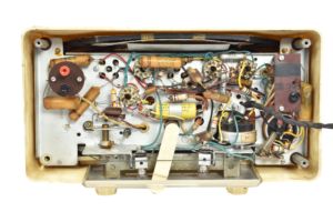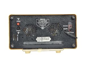 This 5-valve receiver manufactured by Ekco was first introduced in 1950. Housed in a cream moulded plastic case with integral carrying handle.The set could receive both the Medium and Long wavebands, a slide switch under the tuning scale is used to select the bands. Internal frame aerials provided signal reception on both bands.
