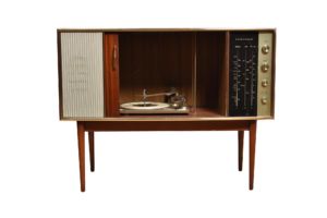 Manufactured by Ferguson in 1967. This 6 valve radiogram was finished in a sapele veneered wooden cabinet with gold plastic trim. A roller blind type sliding door gives access to a two speed auto-changer and a record storage compartment. The radio has medium wave, long wave and VHF receive capabilities.