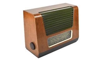 This 5-valve AC mains table model also known as the ‘fleur-de-lis’ was manufactured by Thorn in 1956. The cabinet surface is covered in a light teak veneer with gold trim. This radio featured 3 reception wavebands, medium, long and VHF selected by means of a rotary switch. Internal aerials include a FM plate dipole and a rotatable ferrite rod for AM reception. Extension sockets at the rear were provided for gram pick-up, speaker, aerial and earth connections.