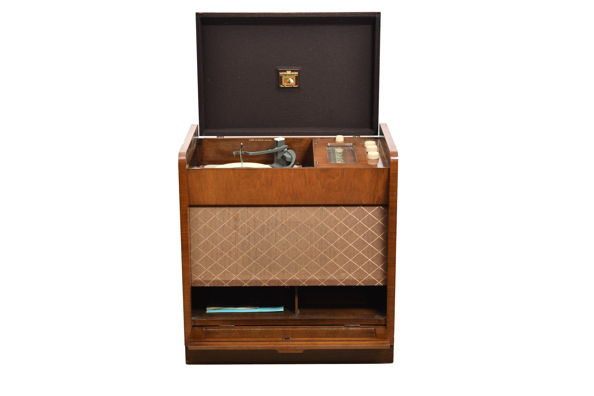 HMV 1621, valve radiogram, AC mains, console model, record player, 4 speed autochanger, long wave and fm radio, walnut veneered wooden case with diamond pattern fabric on speaker on front. Lifting lid and pull down door on front.
