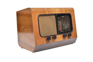 Manufactured by HMV in 1946. This 6 valve radiogram was finished in a walnut veneered wooden cabinet. A top-opening lid gives access to a single speed (78) auto-changer deck, which allowed up to 10 records to be loaded and played sequentially. The radio has medium wave and long wave receive. An internal frame aerial is provided for reception of local stations.